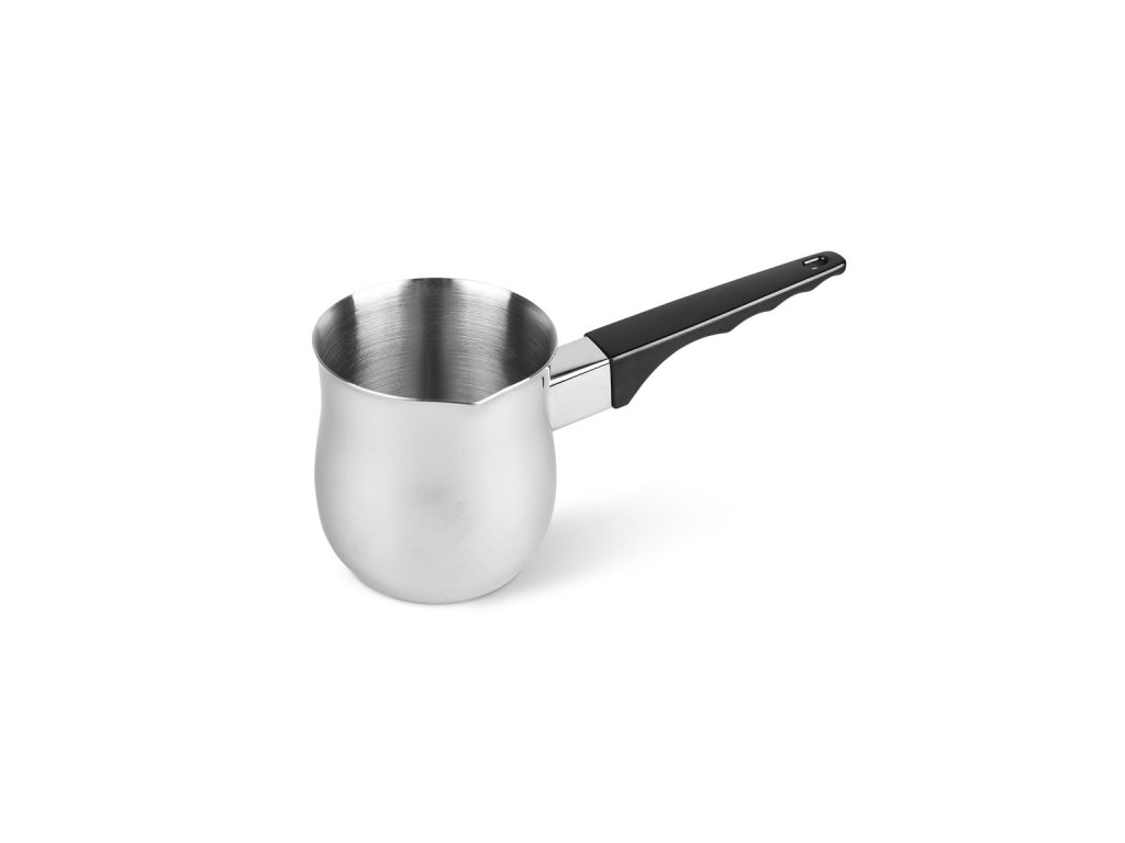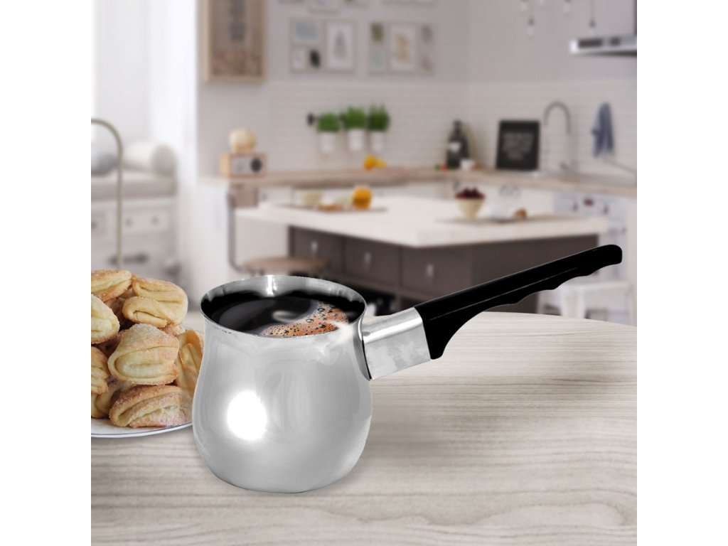 Tato konvice na tureckou kávu je navržena tak, aby zaručila perfektní přípravu aromatického nápoje. Nerezová ocel zajistí optimální vedení tepla a dlouhou odolnost, zatímco plastová rukojeť zůstává chladná, takže se při přípravě nepopálíte. Díky univerzálnímu provedení lze džezvu používat na všech typech sporáků – plynových, elektrických, sklokeramických i indukčních. Její kompaktní rozměry navíc umožňují snadné skladování i každodenní používání.