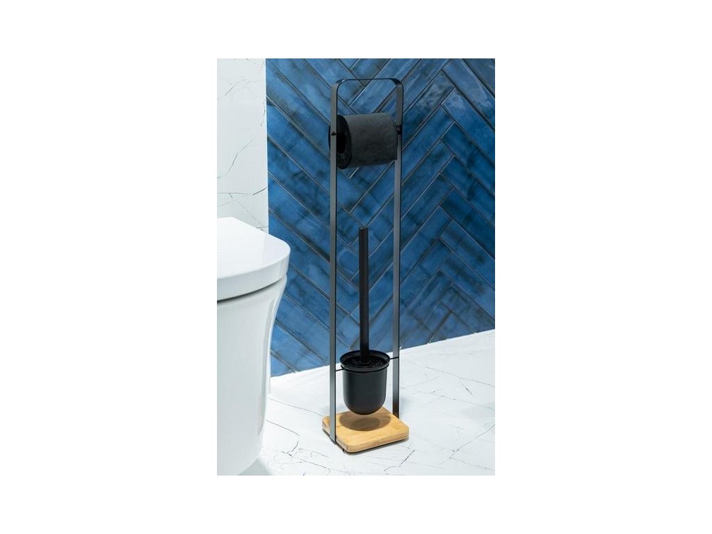 Moderní koupelnový stojan na toaletní papír se závěsnou toaletní štětkou. K jeho výrobě byla použita ocel lakovaná černě s matným povrchem. Základna stojanu je vyrobena z přírodního bambusu a má dodatečné zatížení, díky čemuž je masivní a stojan je stabilní. Bambus je praktický materiál, který je vysoce odolný proti vlhkosti a deformacím, takže se skvěle hodí do koupelny nebo na toaletu. Pro ochranu podlahy a základny před poškrábáním je toaletní stojan vybaven čtyřmi silikonovými nožičkami. WC kartáč má plastovou nádobu, která je umístěna na drátěném kroužku uvnitř stojanu.
