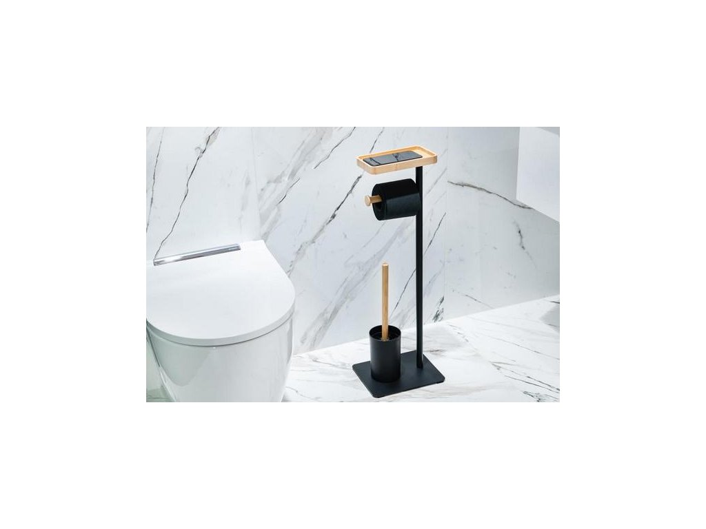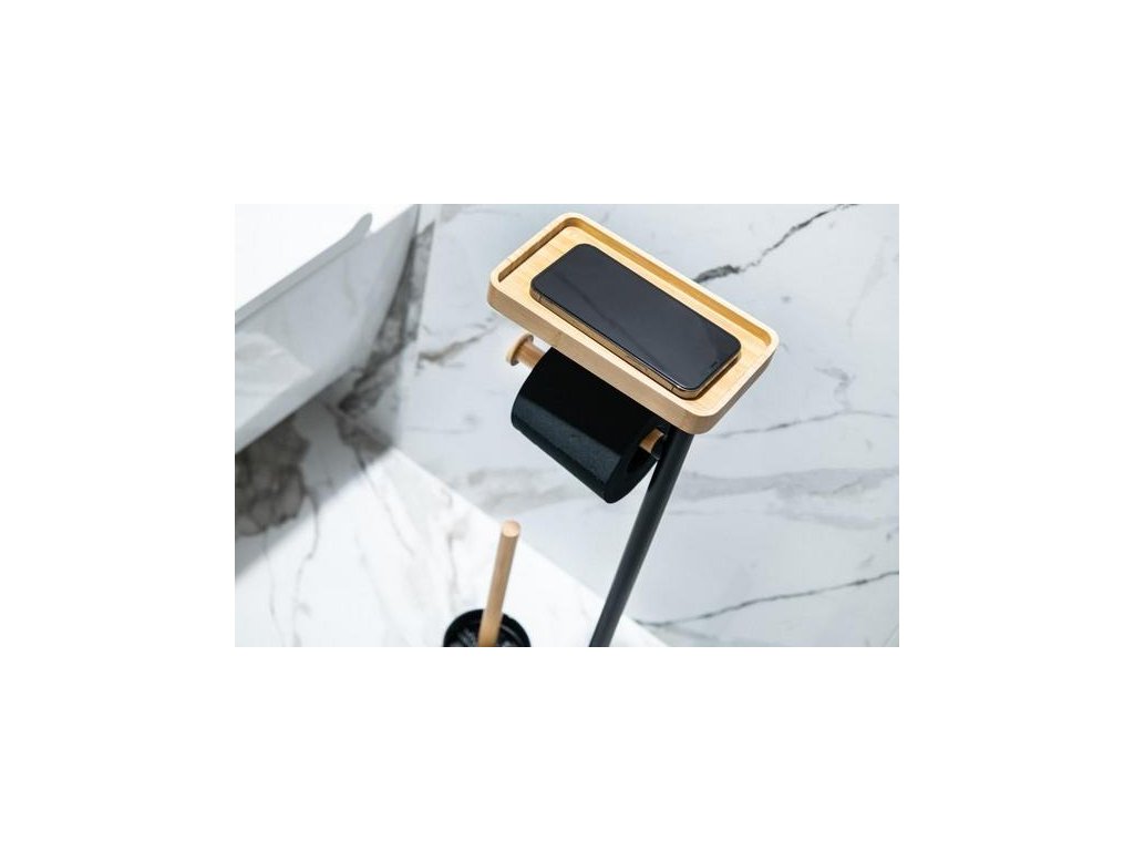 Stojan na WC kartáč s poličkou a držákem na toaletní papír je skvělou kombinací moderního designu a praktického příslušenství do koupelny. Stojan je z ocelového materiálu s černým lakováním a má dekorativní prvky z přírodního bambusu.