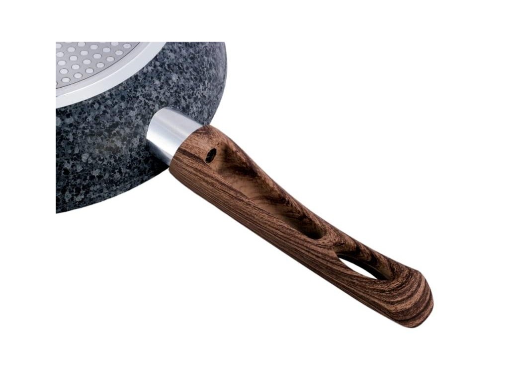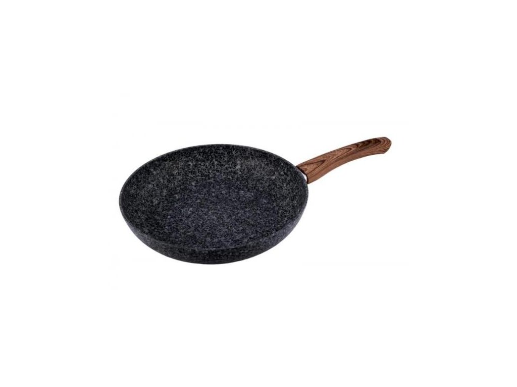Granitová pánev o průměru 28cm s nepřilnavým povrchem odolným proti poškrábání a vysokým teplotám. Stěny a dno se rychle zahřejí a teplo udrží dlouho.