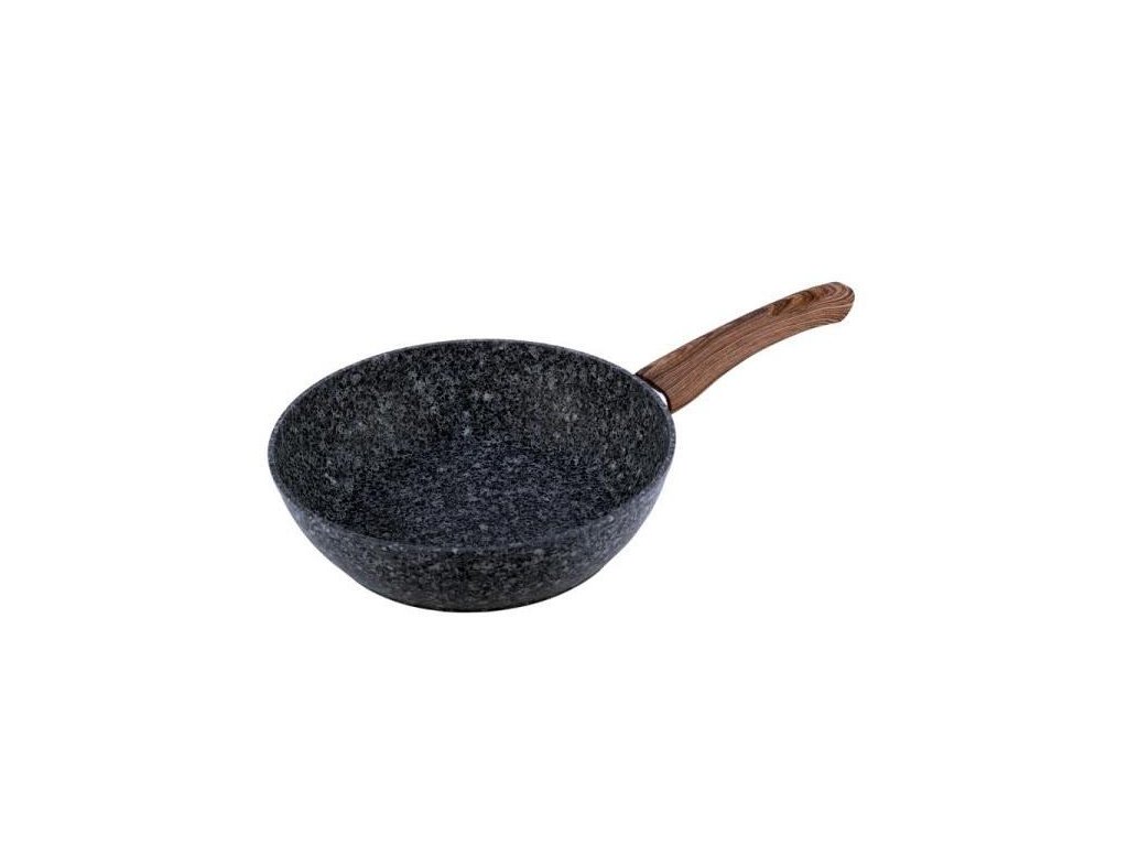 Granitová pánev o průměru 26cm s nepřilnavým povrchem odolným proti poškrábání a vysokým teplotám. Stěny a dno se rychle zahřejí a teplo udrží dlouho.